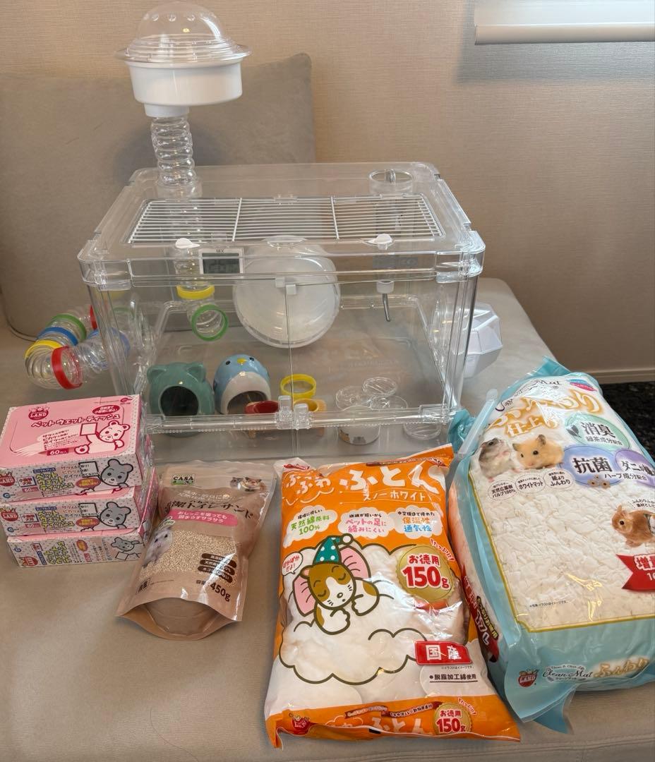 透明プラスチック製のハムスターケージと付属品、木製マット、餌が揃ったセットです!消耗品を沢山ストックしてたのですが、思いの外早めにお空に旅立ってしまったため出品します。いーちゃんSANKO 小型ケージ ホワイト。ハムスター飼いに必要なものは一通り揃っています!床材マットだけで5000円程度しますので、大変お買い得に設定しています(^^)- ケージタイプ: 透明プラスチック製ケージ(上の部分が外れて洗えるタイプです!写真11枚目の通り、左側の手前の部分が少し割れてしまい、セロハンテープで補強しておりますのでご了承ください。グラスハーモニー 600。使用で不都合が生じることはございませんでした。SANKO ルーミー60 ゲージ。)- 付属品: ①掃除用具②給水器③回し車(置くタイプ)④餌入れ(陶器)⑤トイレ⑥お風呂⑦お掃除時や移動時用の虫かご⑧巣箱(出品にあたり天日干しした際に、階段部分が一部割れてしまっております。おくわさま専用ページ。写真5枚目。デグー飼育用ケージと付属品セット。接着剤で補修してお使いいただけると思いますが、おまけと考えていただければ幸いです。マルカン CASA 鳥 セレクトケージ Bird40 40×50×56.5cm。)- 消耗品①床材 木製マット(9袋)すべて未開封②餌の種類: ハムスターセレクション 150g✖️2袋のうち1袋使用済みのため、150g1袋③広葉樹のトイレ砂 開封済み。Cha-Yar CASA 小動物 モモンガ ケージ セット。8割ほど残っています。グラスハーモニー600 セット ハムスター。④バスサンド 開封済み。【ふくちゃん】大きなハムスターケージ 【Advanced model】。4割程度残っています。SANKO C42 イージーホーム ネクスト70 ホワイト うさぎ 小動物ケージ。素人検品なので見落としがありましたらご容赦ください。【ドロップ】大きなハムスターケージ 【Advanced model】。自宅保管の中古品ですので、神経質な方や新品同様をお求めの方はご購入をお控えください。クリアフロント80 かわいい姿がよく見える。即購入OKです!複数購入の場合は少しお値下げできますのでよろしければ他もご覧下さい。フクロモモンガなど小動物用ハンモック。ご不明な点がありましたらお気軽にコメントください!お店の情報