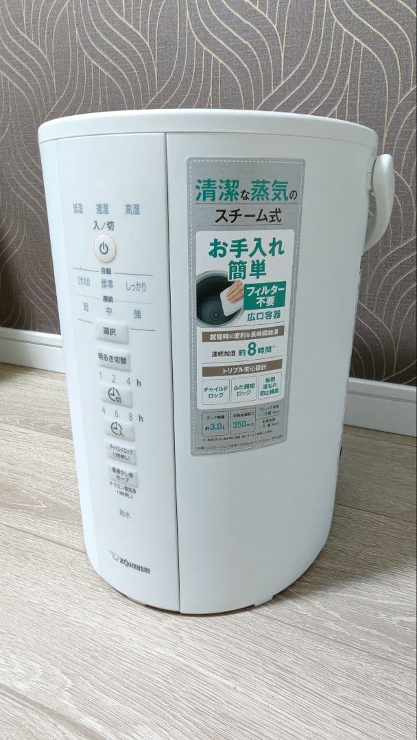 三菱重工冷熱製 スチームファン蒸発式加湿器 SHE120VD-W木造20畳まで/プレハブ洋室33畳まで高性能&信頼の日本メーカー製✨1月25日に購入し、実質3ヶ月ほどの使用です。非喫煙の環境で使用していました。引越しに伴い出品いたします。新居が非常に乾燥していたため、強力な加湿力を求めてこちらを購入しましたが、期待以上の性能でしっかりとお部屋を潤してくれました。冬場の乾燥対策に最適です!【商品の状態】・全体的にきれいな状態です。・多少のカルキ汚れがあります。・蒸発布には使用による汚れがございます。気になる方は新しいものをご購入ください。【おすすめポイント】・スチーム+ファンで清潔・パワフル加湿!・加熱式なので衛生的で安心。・寝室やリビングにも馴染むシンプルデザイン。・お手入れも比較的しやすく、冬の必需品です。加湿方式:スチームファン蒸発式、加湿能力:1200ml/h、加湿のめやす:〔木造和室〕20畳(34m2)、〔プレハブ洋室〕33畳(55m2)、続加湿時間:約8時間以上(環境条件、運転条件により連続加湿時間は異なります。) 、電源:単相100V(50/60Hz)、消費電力:最小440~最大880W、タンク容量:約5Lx2個、運転音:29dB本体寸法/重量:幅440x奥行290x高さ320mm(ハンドルを倒した状態) / 約7.4kg(満水時約18.2kg)、電源コード:125V 7A マグネットプラグ式2m【省エネ、安全、クリーンで、お手入れ簡単なスチームファン蒸発式】イオンフィルターとBIOフィルターの効果で、水も空気もキレイなうるおいをお届けします。デジタル湿度表示やタイマーなど機能も充実しています。【加湿のしくみ】水受皿にタンクから給水され、蒸発布が水受 皿の水をすばやく吸い上げます。(毛細管現象)吸い上げた水分が加熱ヒーターで100度に加熱され蒸気になります。水分が蒸発した分、水を吸い上げ連続加湿をします。蒸発布は、スケール(水に含まれるミネラル分等) を取り除くフィルターの役割もします。【インフルエンザ対策に】同じ22度のお部屋でも、加湿するとウイルスの 生存率が低下します。●発売年: 2021どうぞご検討ください。。T-fal 置き型加湿器 ホワイト。パナソニック加湿器 FE-KXY05 2024年製。新品未使用品 ダイニチ ハイブリッド式 加湿器 本体 HD-RX720。【未使用】cado カドー 超音波式加湿器 PG-E620 ②。YAMAZEN スチーム加湿器 KS-GC281 2.8L。Switchbot 加湿器 気化式。【購入不可!NORIYOSHI出品】バルミューダ 加湿器 Rain。【未使用】nicoja カタログハウス モイスシールド気化式加湿器 ML2061。BALMUDA バルミューダ 加湿器 Rain。象印スチーム式加湿器 EE-TA60-BM ソフトブラック。Airdog moi エアドッグ モイ 高性能加湿器 ワンシーズン使用。象印 スチーム式加湿器 EE-RP35-WA。新品☆象印 スチーム式加湿器 EE-DF35-WA ホワイト。象印スチーム式加湿器 10畳 EE-DF35-HA。【美品/2024年製/日本製】ダイニチ 加湿器 HD-LX1224(W)。加湿器 大容量 5重除菌 加熱式 マイナスイオン 白 ホワイト 卓上 355。【2023年製】象印マホービン スチーム式 加湿器 3.0L EE-DD35。加湿器 a___.9117311__。象印 スチーム式加湿器 EE-DE35-WA 2024年製 加湿器 動作確認済み。加湿器 7.5L 大容量【2025年新モデル】お店の情報